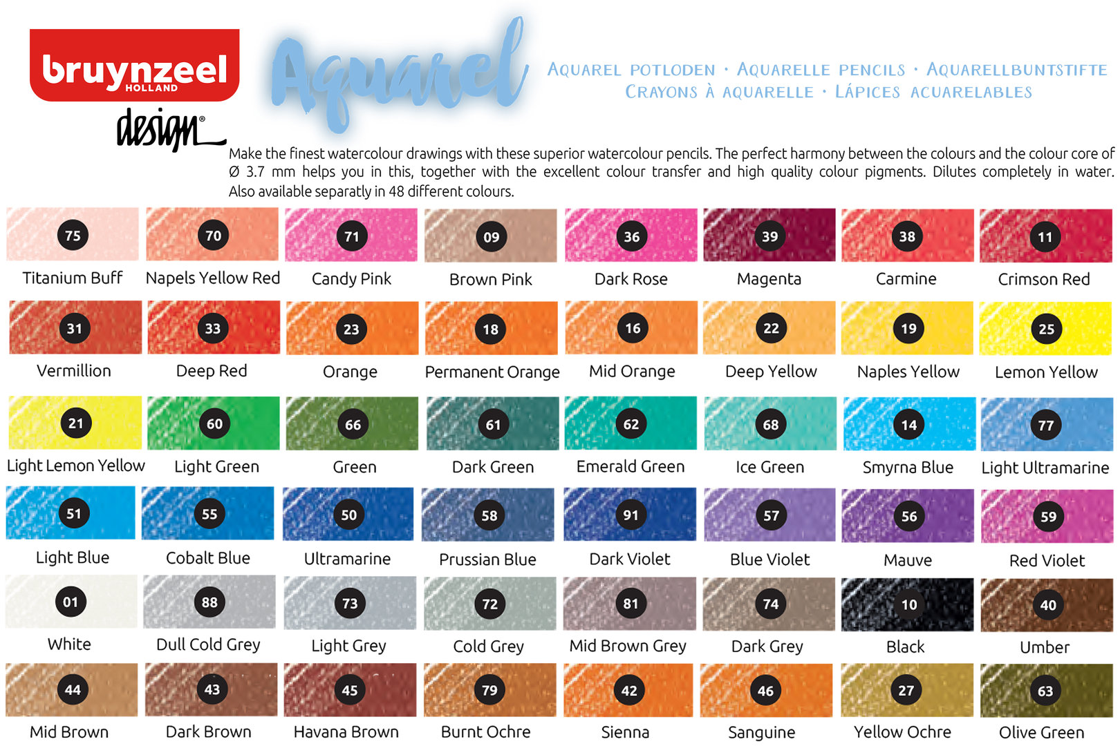 Акварельные карандаши голландского производителя "Bruynzeel" относятся к линейке профессиональных. В производстве грифеля используются только качественные светостойкие пименты. Мягкий стержень позволяет наносить интенсивные насыщенные цветом штрихи. Благодаря двойной проклейке корпуса, карандаши устойчивы к излому и отлично затачиваются. Акварельные карандаши "Design" от "Bruynzeel" хорошо ложатся на бумагу с разной фактурой, цвета на бумаге можно размывать до полного ровного слияния штрихов. Корпус изготовлен из высококачественных пород деревьев. Палитра акварельных карандашей "Design" состоит из 48 выразительных базовых оттенков. Все карандаши можно приобрести поштучно либо в наборах.